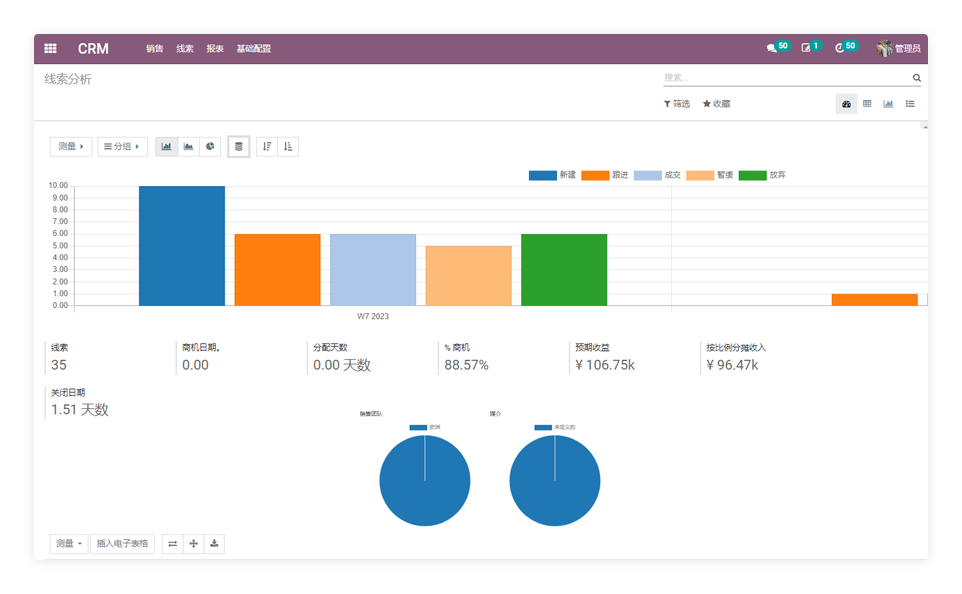 通过线索将客户每次的咨询信息进行记录、内容有产品、预期收益、预计日期,通过销售漏斗的方式对商机进行层层筛选,询盘信息通过不同的状态分类统计。