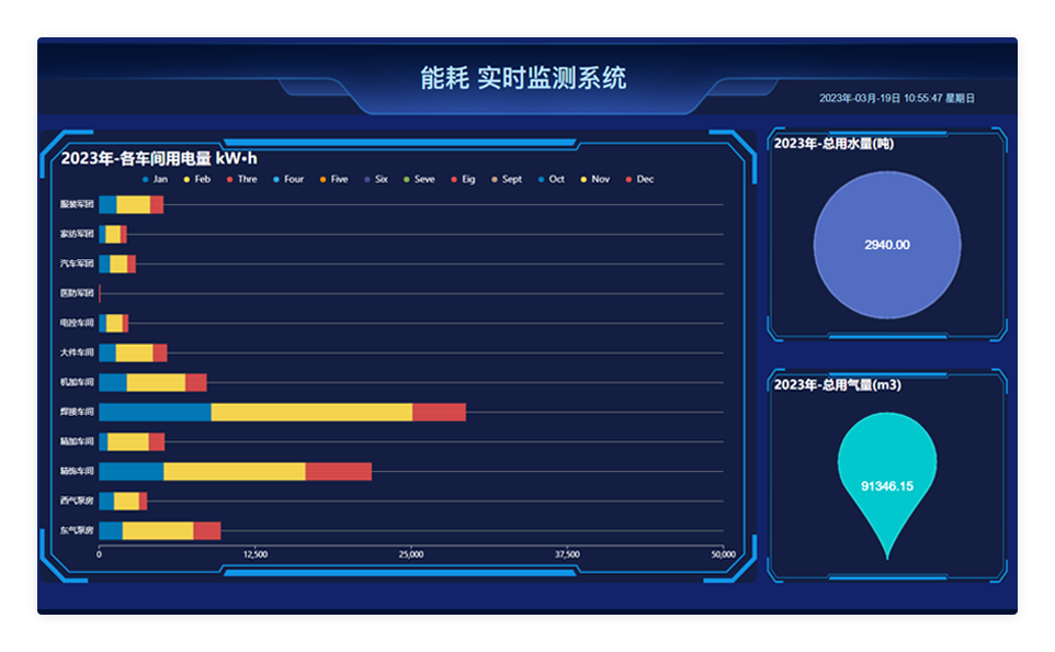 通过对各车间能耗消耗统计,统计准确数据掌握每月固定耗能,监测数据发生异常后及时预警提示。