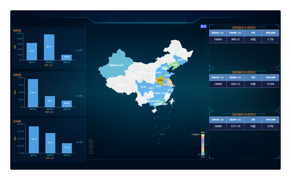 通过数据看板的方式对销售环节所产生的数据进行实时统计,从不同的维度进行记录,协助公司优化销售策略。