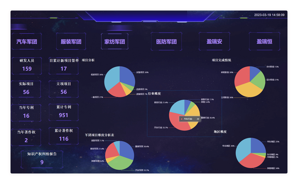 对公司各研发部门人员、项目、专利、著作等不同维度进行数据统计。