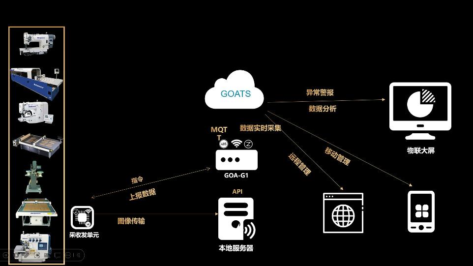 服装、汽车、家纺、医防四个军团生产车间的物联系统:通过在制造生产车间部署物联网关与设备通过车间架设的AP设备以WiFi方式连接通讯采集设备数据。
