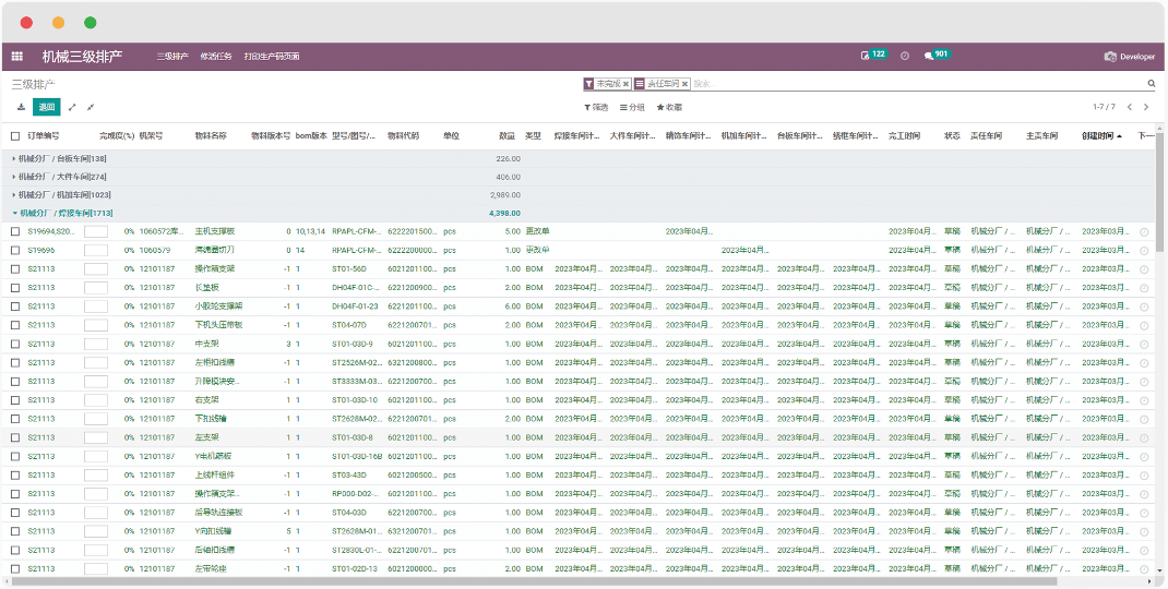 机械主要包括一级排产、二级排产、三级排产、机械生产等四个模块,用于接收研制所、配套等部门下发的生产任务为各部门生产所需物料的工作,保质保量为各部门生产所需要的物料。
