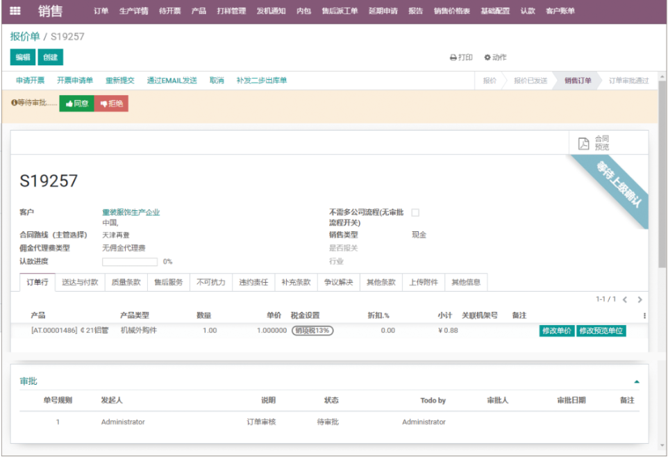 销售合同评审、销售订单多级审批、系统支持自定义审批层级以及审批顺序,业务员可以通过手机、平板、电脑一键提交上级领导审批,系统自动提示待审批信息有效的避免错失重要订单信息,从而提升审批效率。