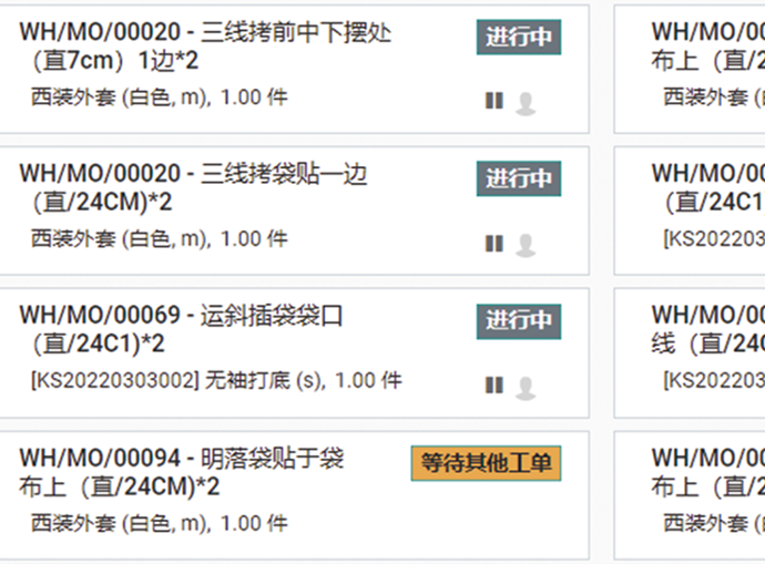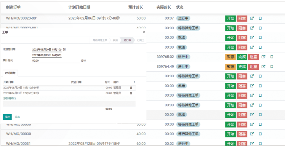 可以查看并管理工单的当前执行状态,通过点击开始暂停,系统记录实际生产的开始和结束时间。