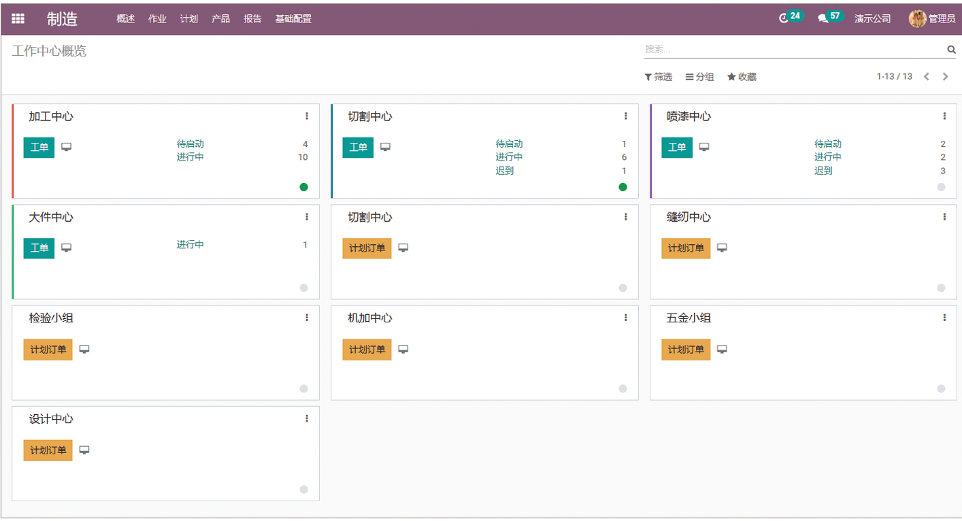 制造模块包括制造订单、整体设备效率、工单这三类报表,实时控制生产率,支持创建自定义统计面板,以便实时监控绩效。