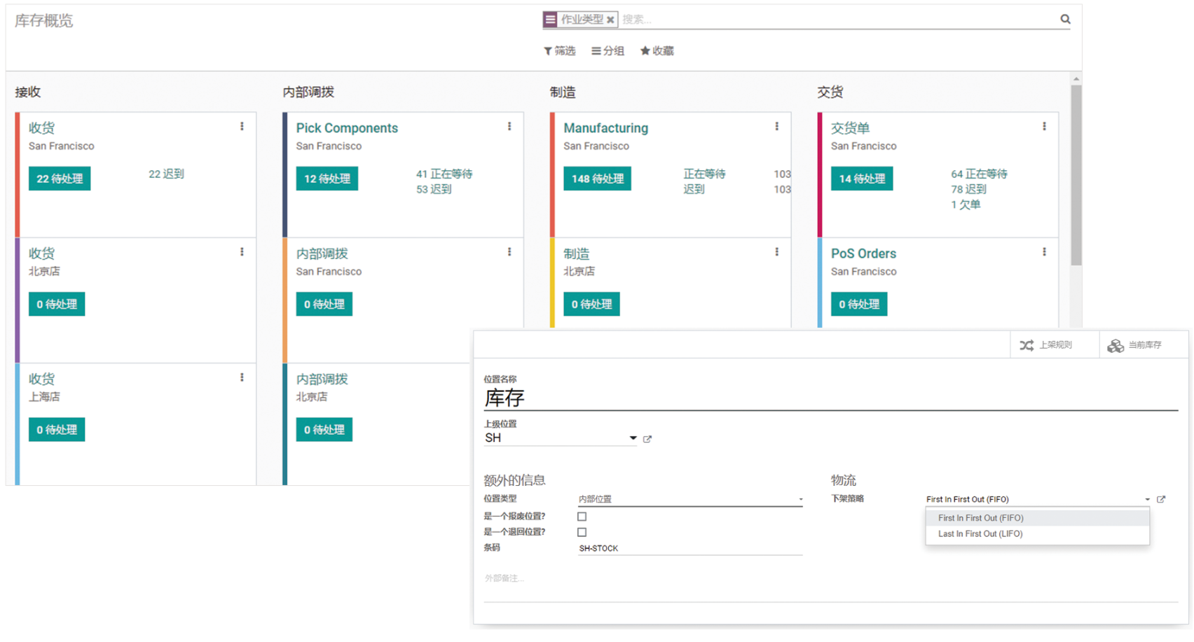 为仓库创建多个位置,分类存放产品、原材料、半成品等,并设置位置类型、下架策略〈如先进先出、后进先出等)