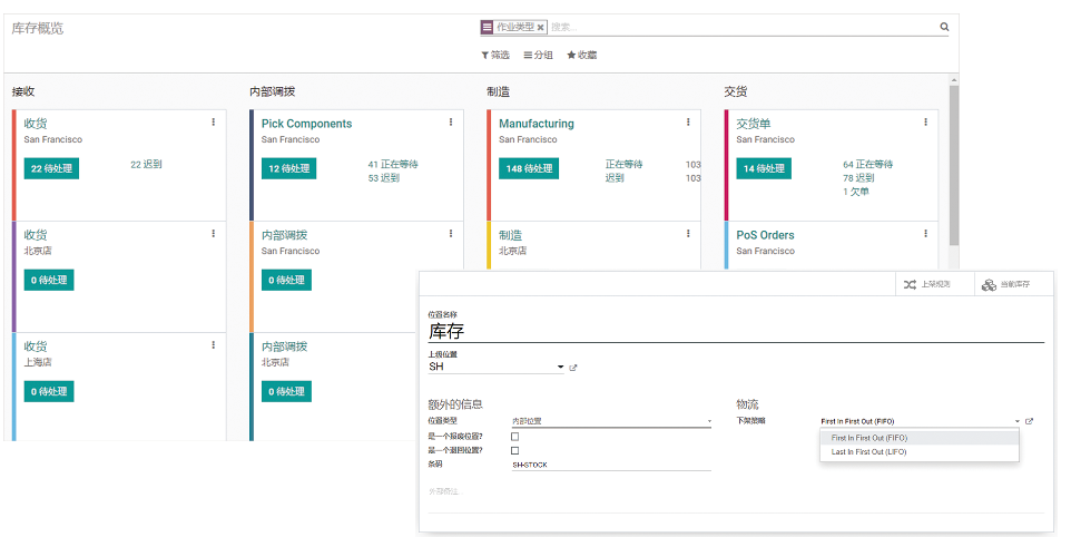 为仓库创建多个位置,分类存放产品、原材料、半成品等,并设置位置类型、下架策略(如先进先出、后进先出等),系统按照在此处的设置,计算先出哪个批次的货物。